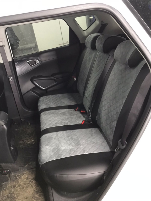 Комплектность чехлов: передние спинки - 2, передние сиденья - 2, задняя спинка большая - 1, задняя спинка малая - 1, заднее сиденье сплошное - 1, подголовники передние - 2, подголовники задние боковые - 2, подголовник задний центральный - 1, подлокотник задний - 1.